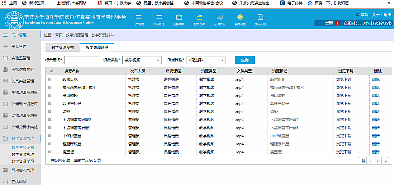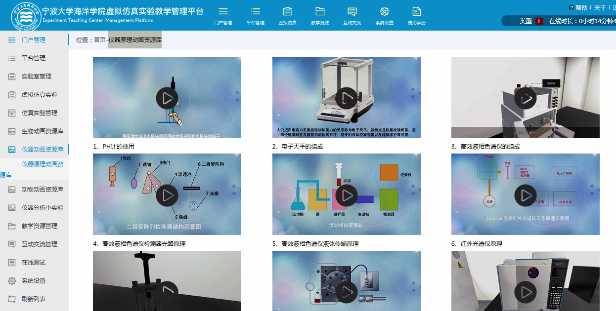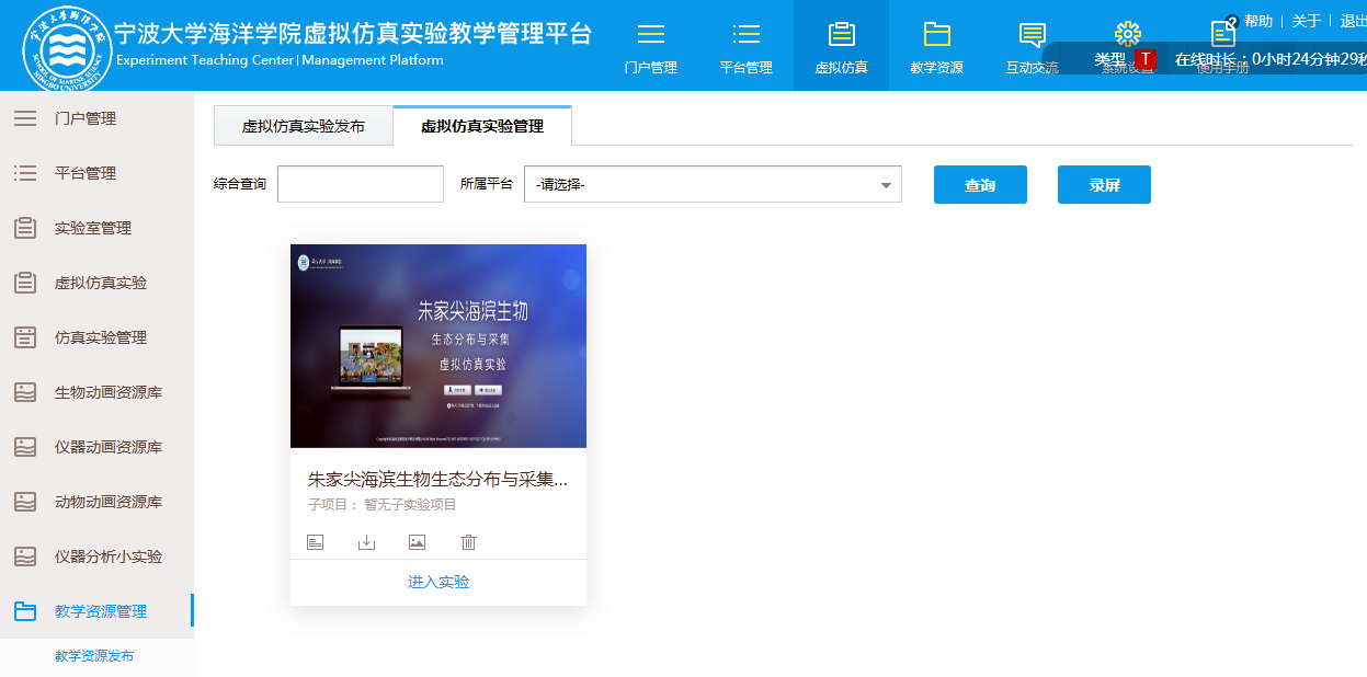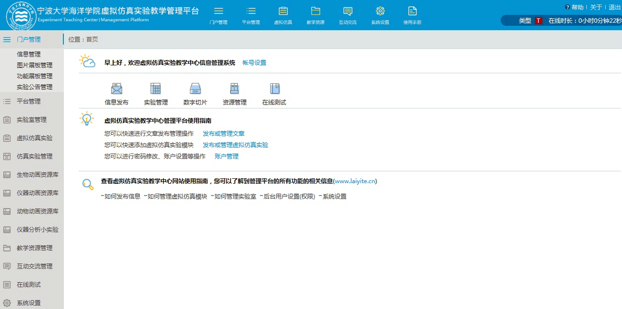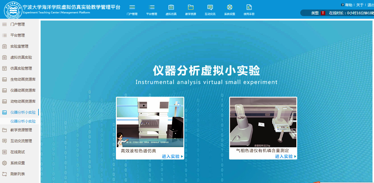 、虚拟仿真、教学资源、教研成果、教学管理、实验教学、管理制度、开放共享等栏目。虚拟仿真实验教学管理平台包括虚拟仿真实验的发布和管理;数字化教学资源管理模块;在线测试模块等。