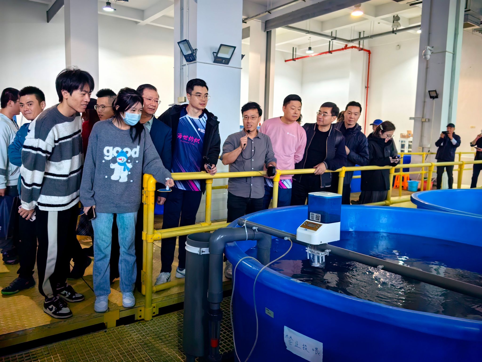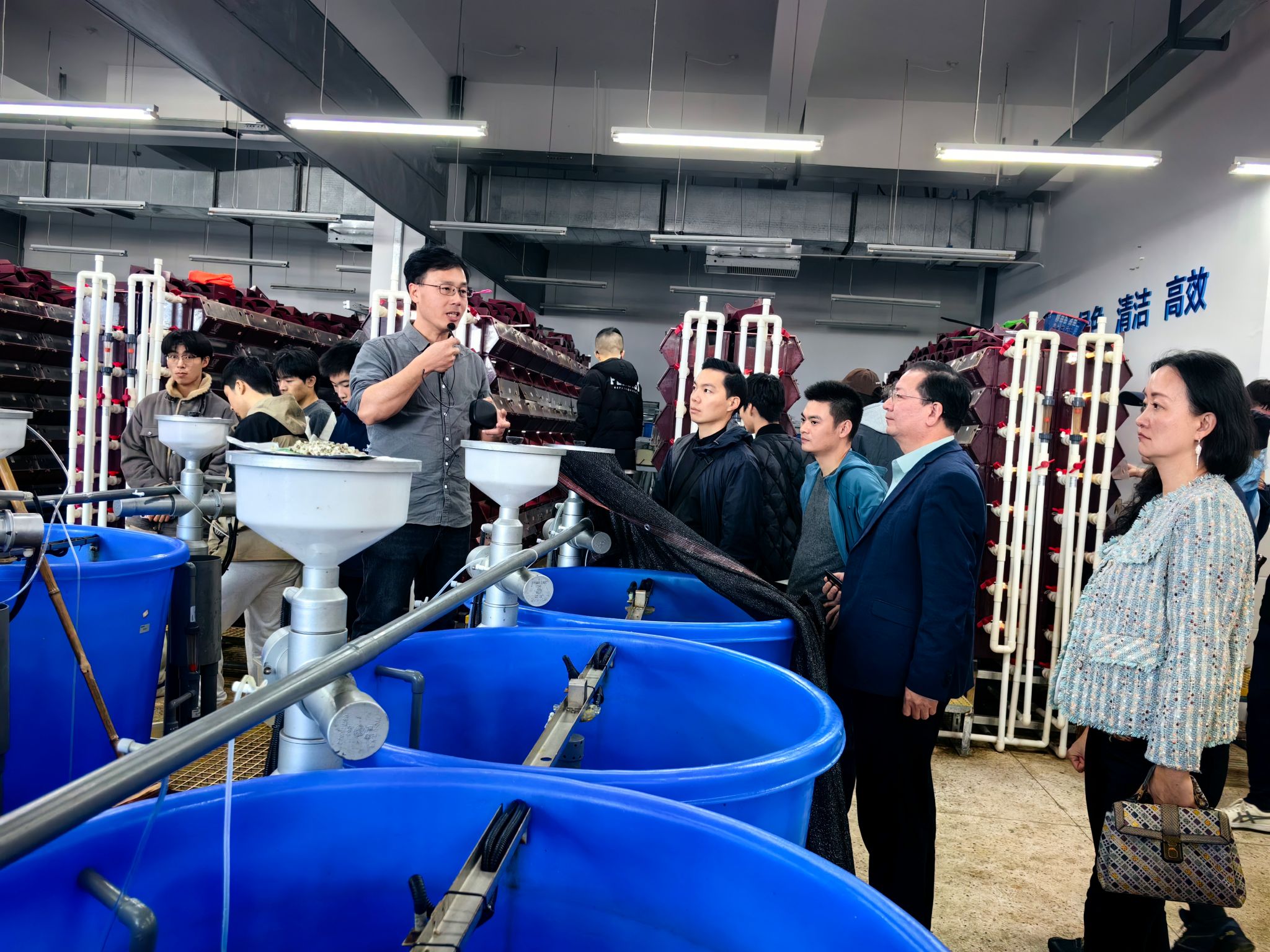 王教授对校友们表示热烈欢迎,并带领大家参观了学院学科发展馆(院史馆)和“渔乐小苑”。在学科发展馆内,王教授详细介绍了学院的发展历程、学科建设、学生工作、地方服务及校友工作中取得的成绩。在“渔乐小苑”基地内,王教授介绍了学院智慧养殖系统和蟹公寓等水产养殖设施的优点,围绕在研究的银鲳鱼、青蟹和饵料微藻等特色品种进行了详细的科普,加深了大家对学院的了解。