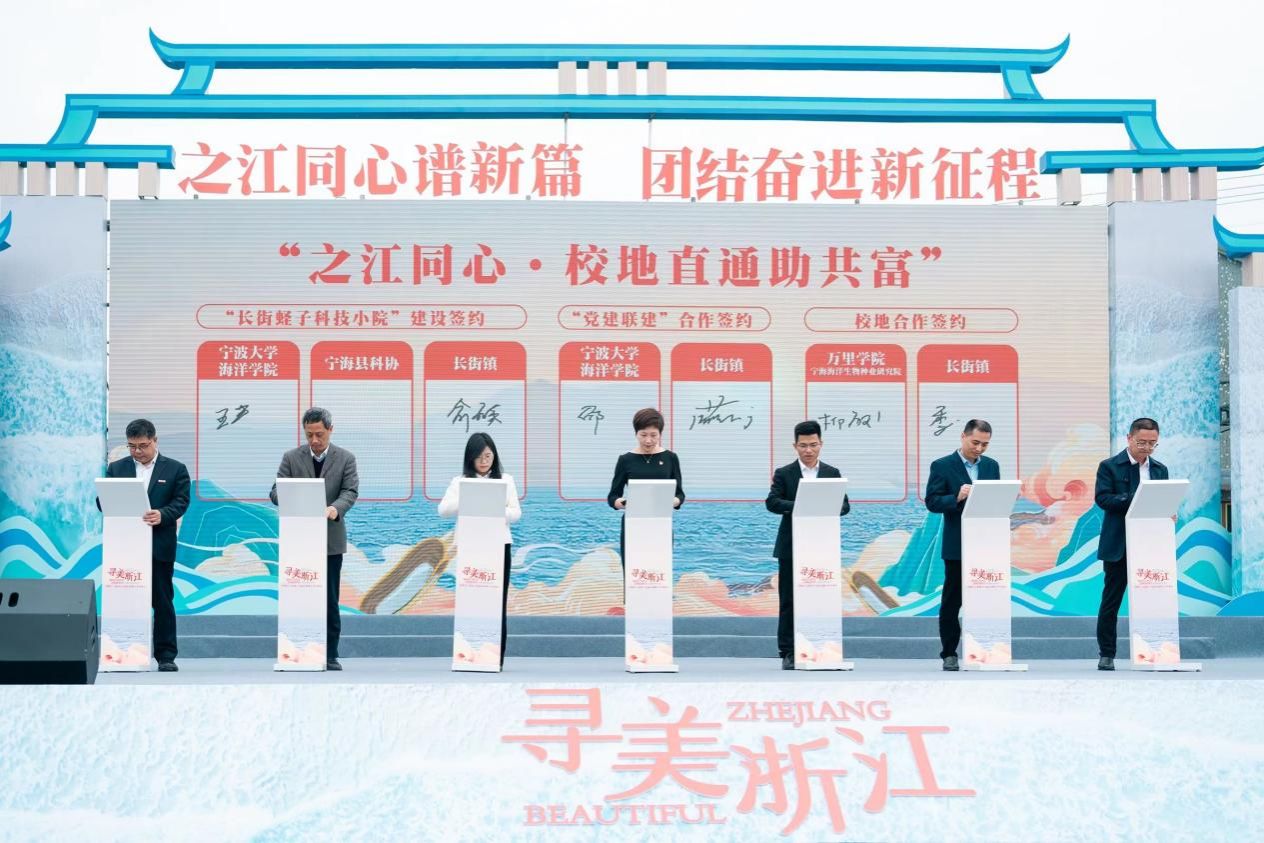 跟宁海县科协和长街镇签订三方共建“浙江宁海长街蛏子科技小院”协议。各方希望以此次签约活动为契机,不断丰富党建联建的内涵,激发党组织活力。同时,推动教育科技人才融合发展,探索地方政府与地方高校协同发展的新型合作模式,积极参与宁海县长街镇“一镇一品”共富示范区项目建设,改变困扰长街镇缢蛏养殖行业多年的高温期缢蛏大批淘汰、池塘养殖尾水难以达标排放的难题,为长街镇渔业绿色发展、水产高效健康养殖提供决策依据和科学技术支撑,实现适应新时代农业农村发展需求的人才培养、技术服务、科研成果转化等全方位一体化链接。