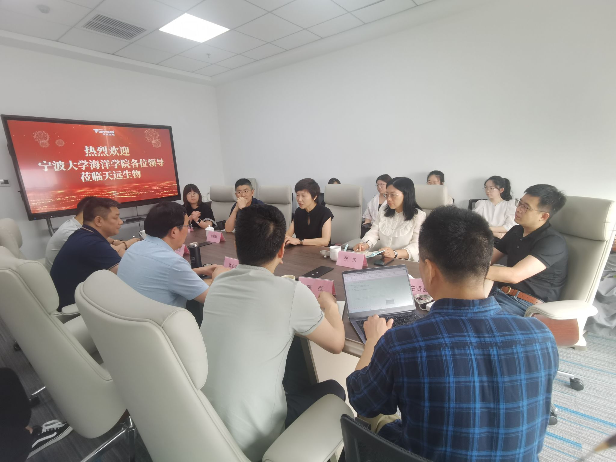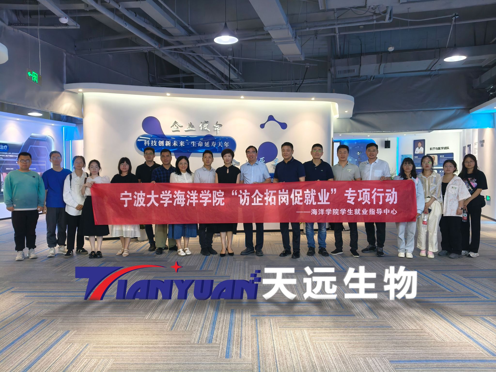 为贯彻落实党中央国务院和省委省政府关于高校毕业生就业工作的决策部署,了解就业市场和企业用人需求,深化校企合作,6月13日下午,海洋学院党委书记邵丽、副院长陈相瑞、党委副书记张乐、副院长徐嘉杰及本硕师生代表10余人一行来到校友企业浙江天远生物科技有限公司,受到了董事长黄必胜、总经理朱鹏程、大客户总经理李杰等公司代表亲切接待。