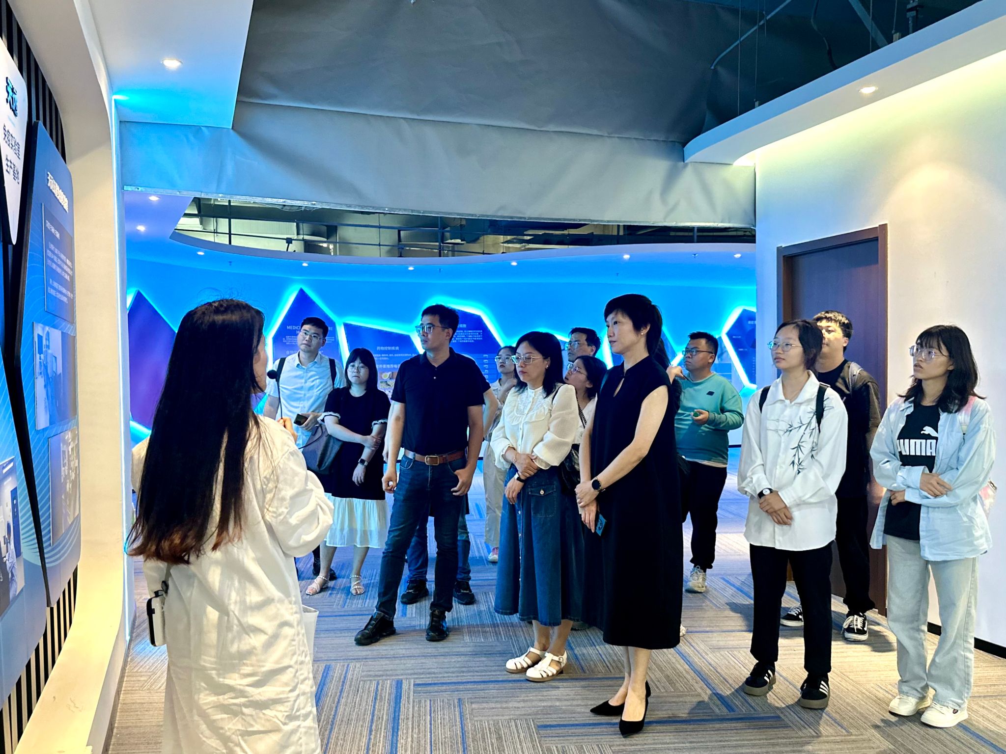 学院师生在公司董事长黄必胜的陪同下,参观了公司展厅,详细了解了公司在生物医疗领域的最新进展与成果以及公司的运营模式、发展战略和未来规划等情况。