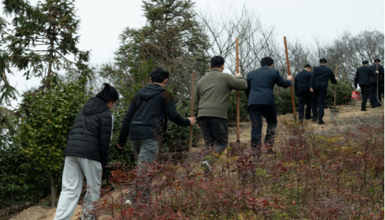 植树现场,来自各单位的党员志愿者展现出高效的团队协作精神。挥锹铲土、扶苗培土、提水浇灌等工序衔接有序,经过两个多小时的劳动,百余株新栽树苗迎风挺立,为早春的山野增添盎然生机。活动不仅践行了生态文明理念,更通过政校企多方联动搭建起绿色发展合作平台。