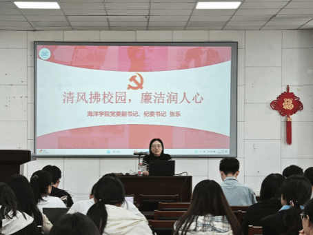 在海洋东楼107会议室举办“清风拂校园廉洁润人心”廉洁教育专题讲座。学院党委副书记、纪委书记张乐主讲,分党校发展对象班学员参加。