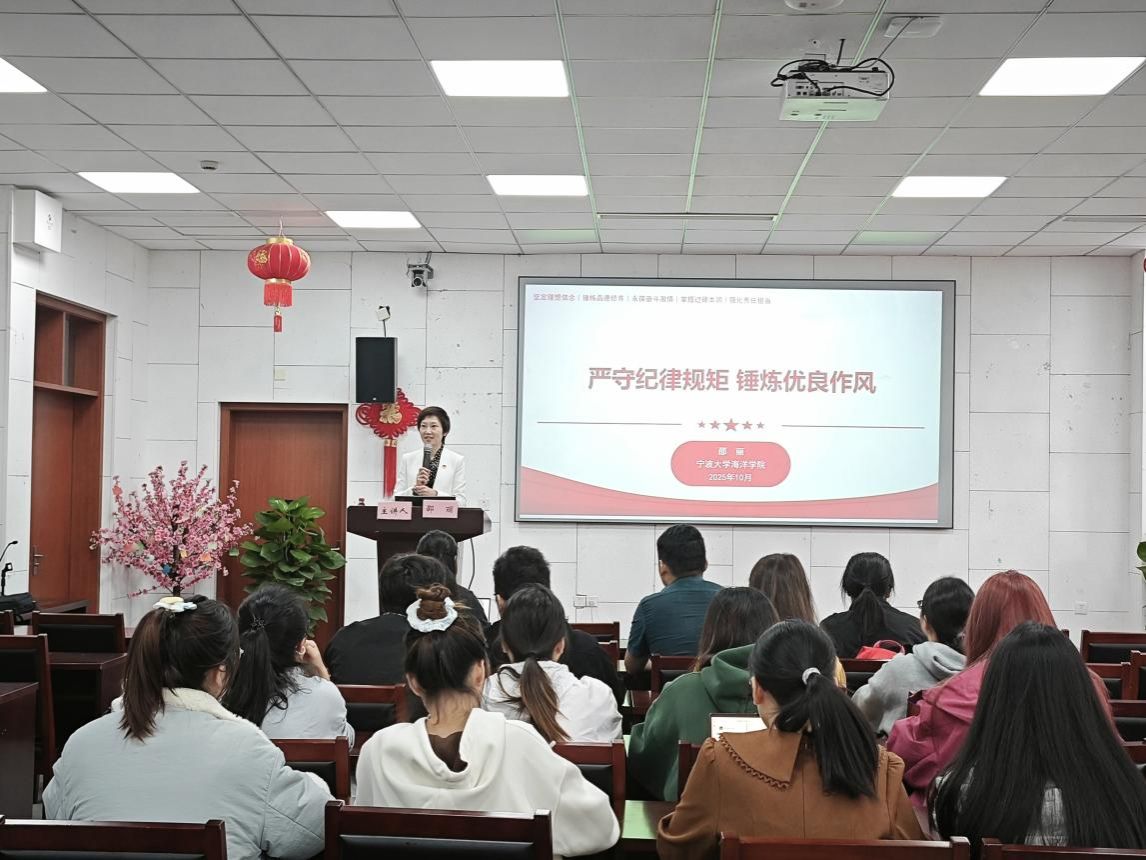 于竺银康楼107成功举办“严守纪律规矩,锤炼优良作风”专题党课。学院党委书记邵丽主讲,43名预备党员班学员共同参加。