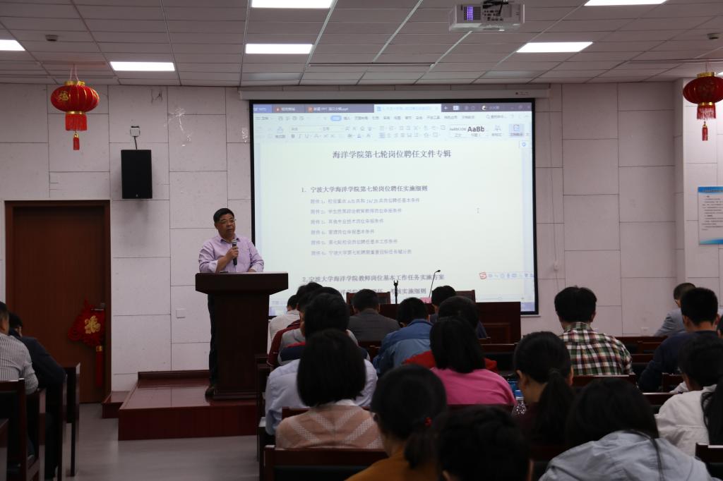 在竺银康楼一楼报告厅召开全院大会,学院党政领导和全院教职工参加了会议,会议由党委书记蔡真亮主持。院长王春琳对学院第七轮聘任文件进行了解读,并就研究团队的组建与考核做了详细说明,同时对行政教辅岗位的聘任情况进行了通报。会上,王春琳表示第七轮聘期相比上一轮任务更重、质量更高,这对学院学科建设和发展提出了更高的要求。水产学科冲A以及生物学博士点的申报需要全体老师一起努力。随后,学院各分管领导就学院科研、本科生和研究生教学与培养、地方服务、学生工作等方面做了具体部署。
