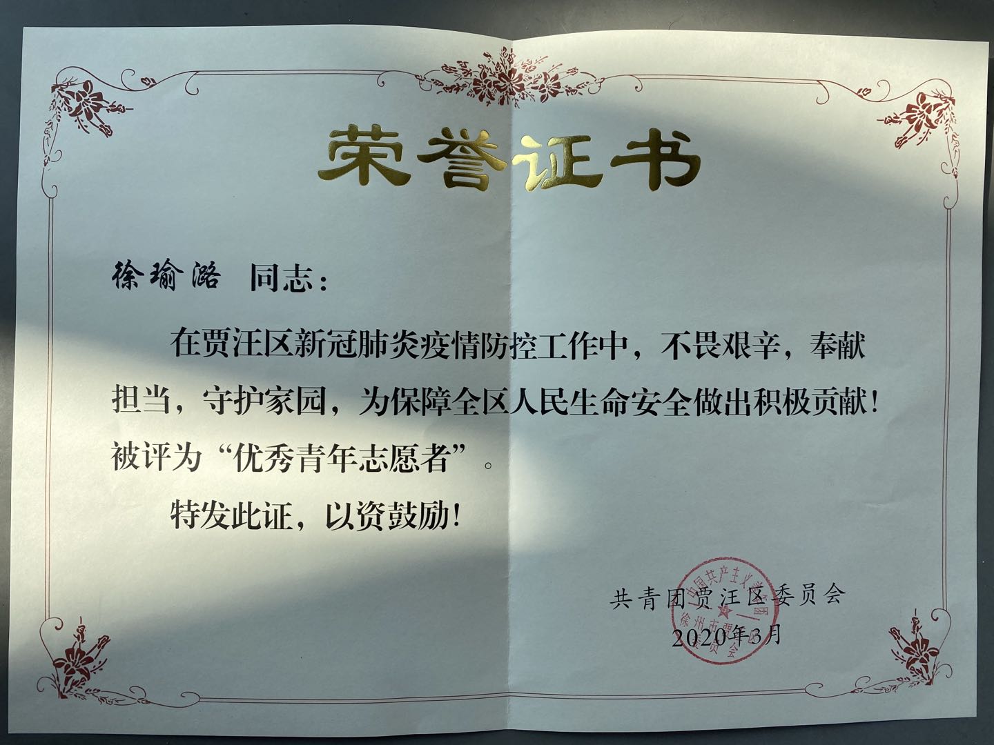 收到共青团徐州市贾汪区委员会寄来的《致防疫志愿者的感谢信》、《荣誉证书》以及表彰文件,感谢和表彰91视频