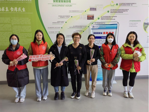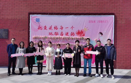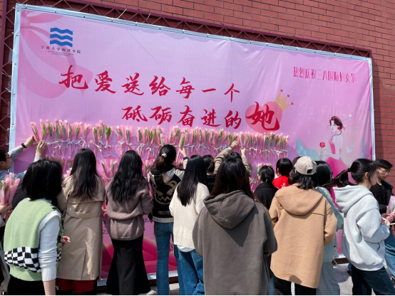 团委在梅山校区举办了主题为“把爱送给每一个砥砺奋进的‘她’”的三八国际妇女节活动。活动现场,主题喷绘海报上用心装点的一束束娇嫩的鲜花,映衬着满墙的祝福,“与时代同行”“巾帼心向党,奋斗新征程”“保持天真,心怀柔软”“女性的力量无可限量”……,大家取下鲜花送给自己,或把爱与祝福传递她人。学院党委书记邵丽、副院长陈相瑞、党委副书记张乐、学科带头人姜海波等教师代表到场为女大学生榜样献上鲜花,并致以节日的问候和诚挚的祝福。