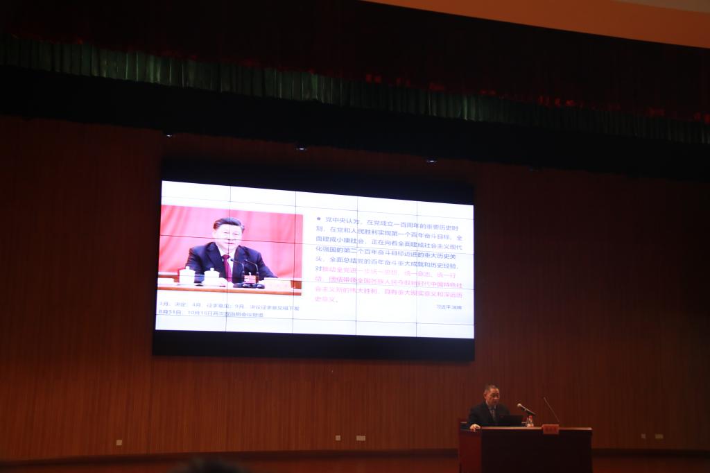 党委书记书记蔡真亮给各位党员同志作《总结百年恢宏历史,凝聚复兴磅礴力量》的宣讲报告。