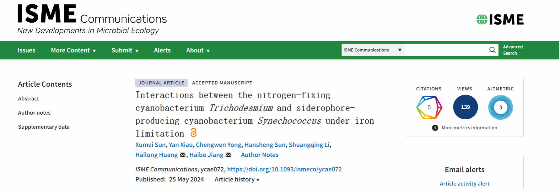 姜海波教授、孙旭梅副教授在Nature出版集团旗下的微生态领域知名期刊《The ISME Communications》上发表题为“Interactions between the nitrogen-fixing cyanobacterium Trichodesmium and siderophore-producing cyanobacterium Synechococcus under iron limitation”的研究论文(图1),揭示了海洋主要固碳蓝藻(Synechococcus)和主要固氮蓝藻(Trichodesmium)及其微生物群落在竞争性获取铁元素中的互作机制。
