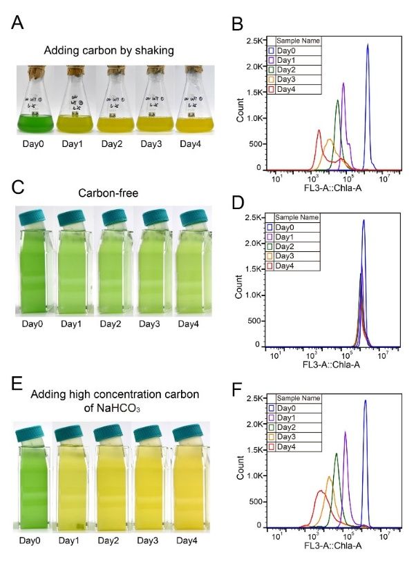 姜海波教授课题组研究发现,海洋蓝藻——聚球藻PCC 7002在受到氮限制时,通过降解藻胆体为细胞提供氮源,但藻胆体的降解必需有外界碳源的补充才会发生。当隔绝外界碳源进入时,藻胆体不会发生降解(图1)。只有当细胞摄入过多的碳、较少的氮时,聚球藻才会启动藻胆体降解相关基因(nblA、nblB等)的表达并降解藻胆体,维持胞内具有活性的碳和氮的浓度平衡。失去藻胆体降解能力的聚球藻突变株维持胞内碳/氮平衡的能力下降,导致突变株在高碳/氮比条件下的生长较野生型显著受阻(图2)。转录组结果发现,与野生型相比,突变株在高碳/氮比条件下无法通过降解藻胆体调控碳/氮平衡,转而采用下调氮利用途径和二氧化碳浓缩机制(CCM)来应对,因此表现为细胞不失绿、但生长和光合作用受抑制的生理表型(图3)。