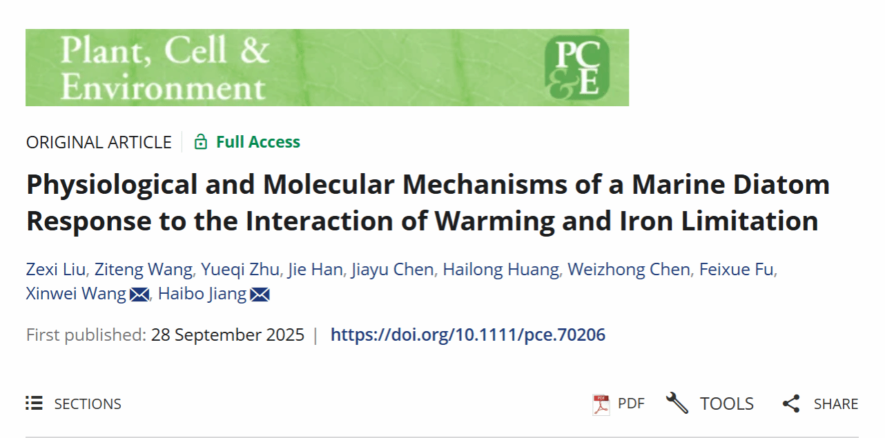 姜海波教授团队在植物学与环境生物学领域知名期刊《Plant, Cell & Environment》(中国科学院一区Top期刊)上发表题为“Physiological and Molecular Mechanisms of a Marine Diatom Response to the Interaction of Warming and Iron Limitation”的研究论文(图1),揭示了海洋硅藻应对全球变暖与铁限制交互作用的生理响应机制。