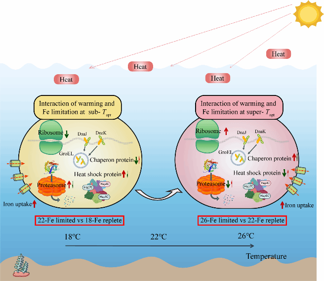 图3:三角褐指藻在亚最适至超最适温度应对升温与铁限制交互作用的关键分子过程示意图
