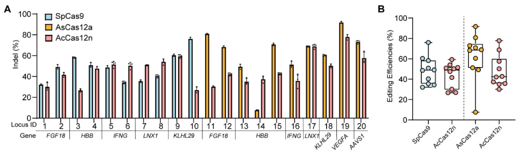 图2. Cas12n系统与Cas9、Cas12a系统的基因编辑效率比较