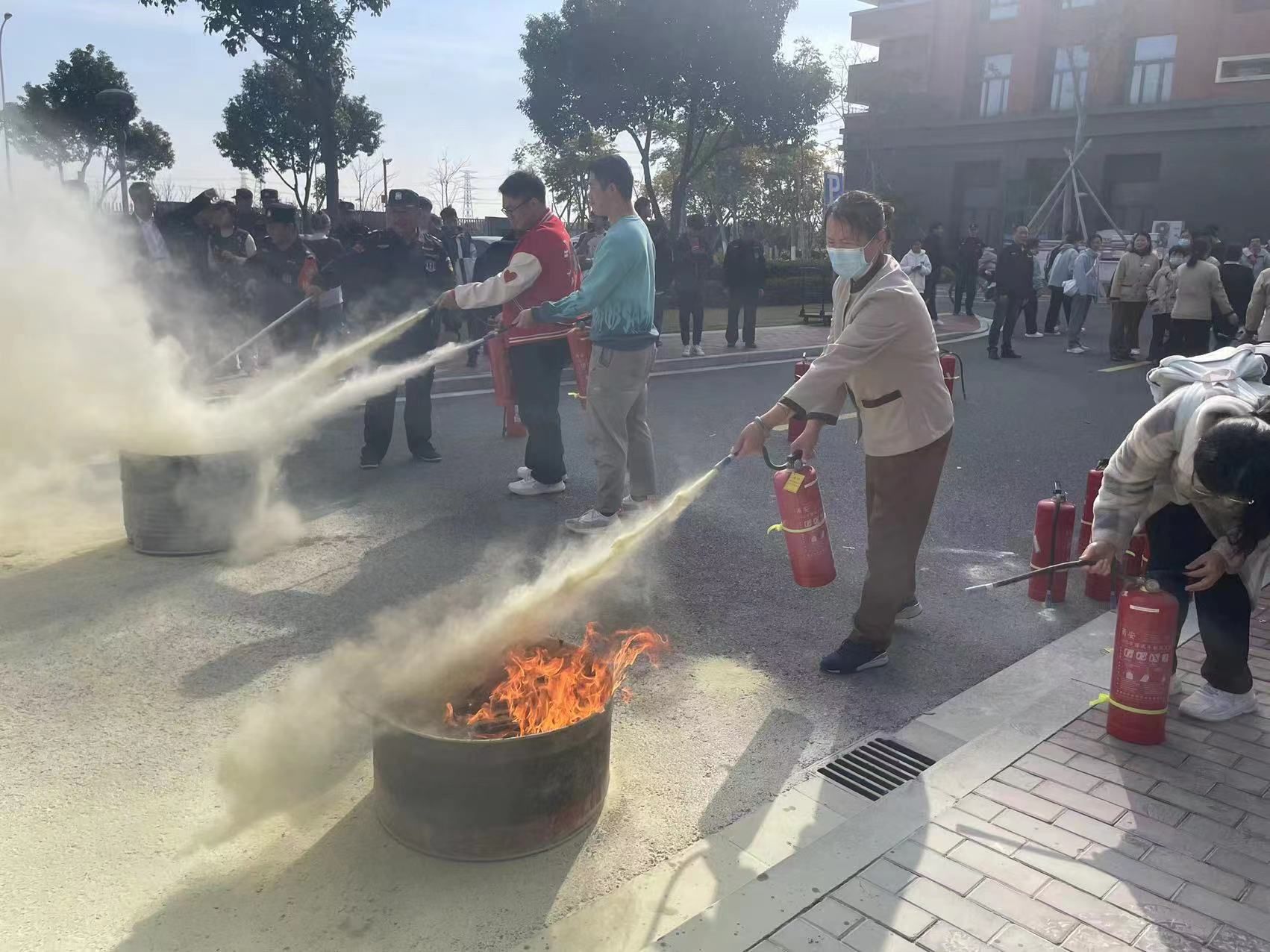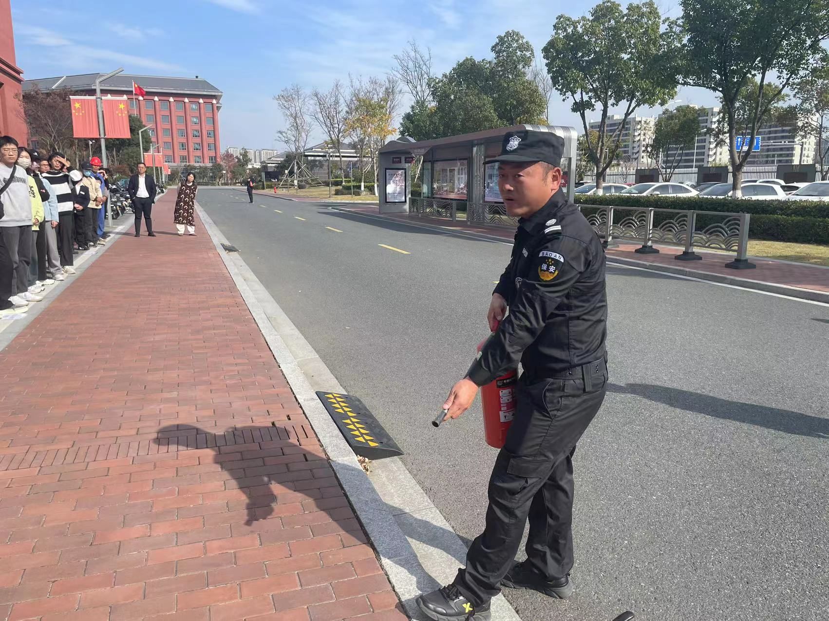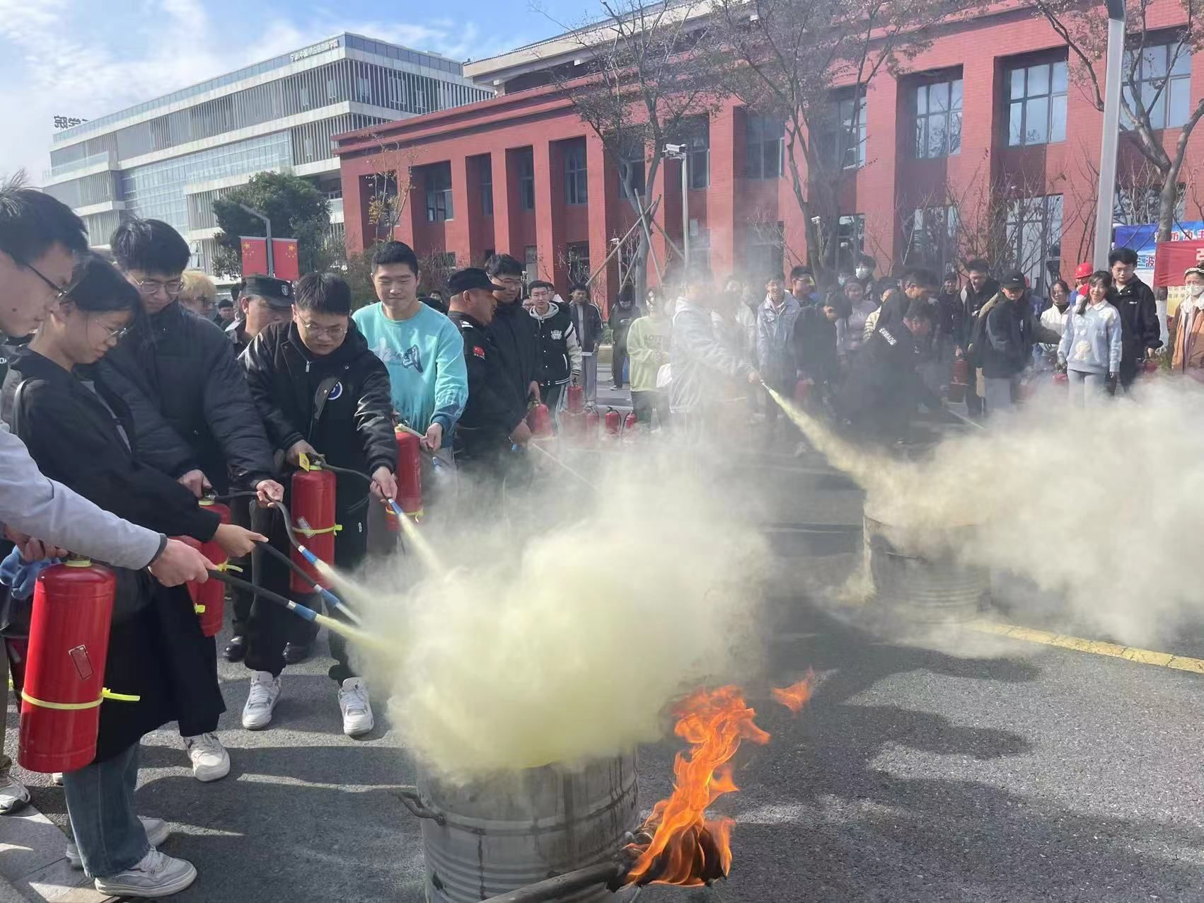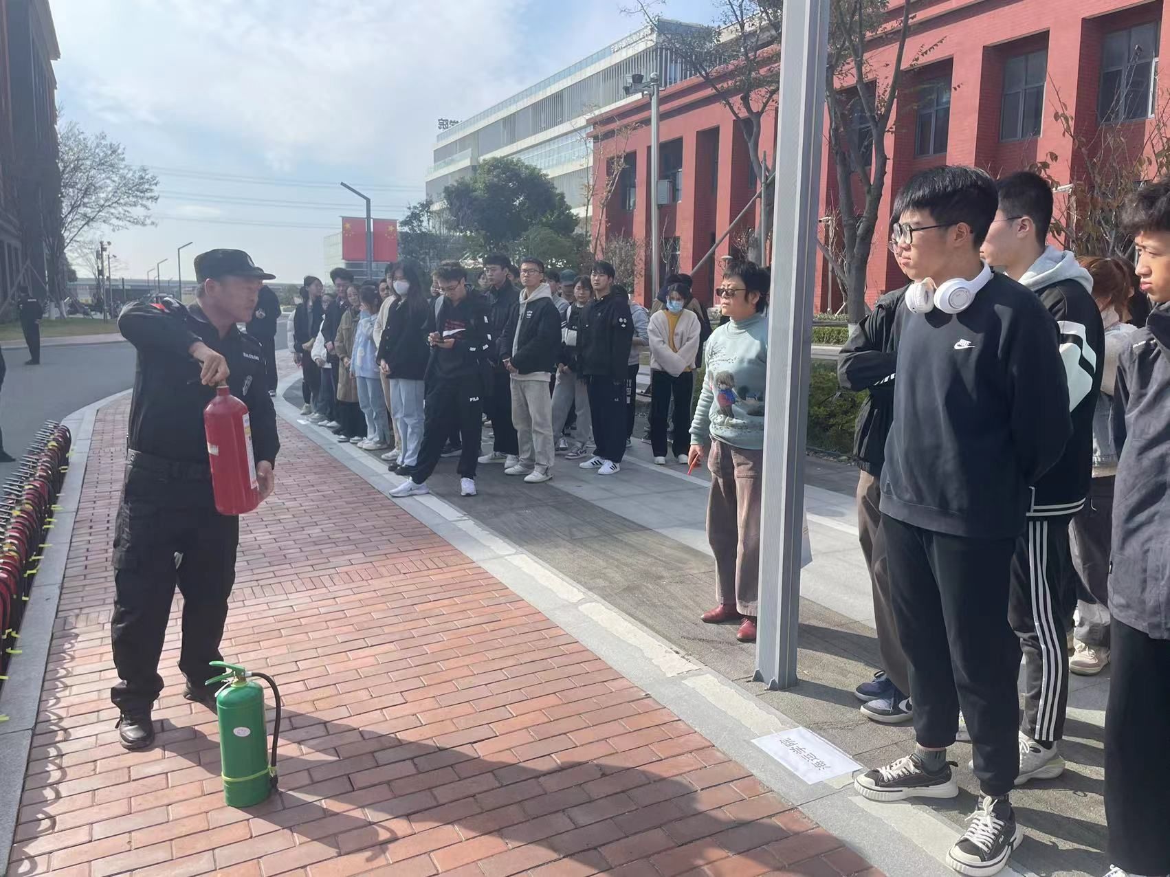 随后,在行政楼前,校区安保队长闫泽龙为大家做了消防安全知识普及,演示了灭火器的操作步骤,包括拔掉保险销、对准火源、均匀喷射等关键动作。通过近距离、沉浸式的互动学习,在场师生们对消防器材的使用方法和使用技巧有了更加深刻的认识。